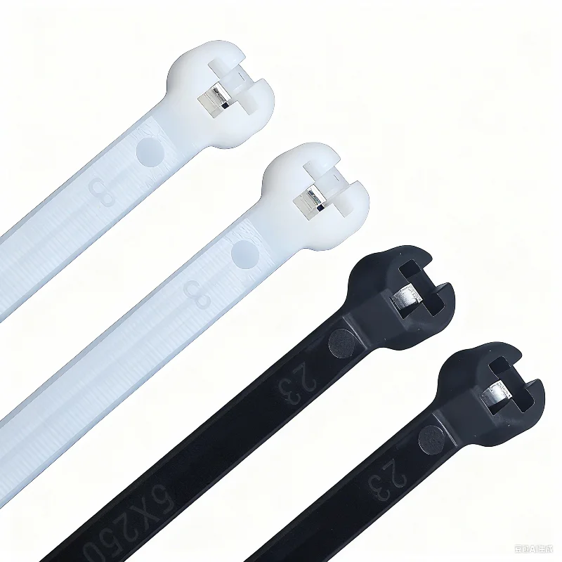 Cable ties with metal lock adopt a one-way insertion design, fundamentally preventing backward loosening after tightening. The metal locking tooth is located at the key stress point inside the head, automatically increasing its grip as the tie is pulled—achieving a “the tighter, the stronger” effect. This hybrid design of a nylon body and metal locking head combines the lightweight advantage of nylon with the durability of metal for outstanding performance.