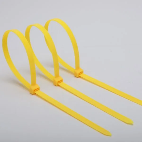 The directional engagement of the beveled teeth on the strap body and the locking tongue triggers a mechanical lock, giving yellow tie wraps their “one-pull lock” engineering properties. Yellow, with its high brightness and saturation, makes its yellow zip ties stand out in a variety of environments. For example, they can be used for packaging medical waste, sealing garbage bags, and labeling. Their eye-catching color facilitates easy identification and management, and they are convenient to use and durable.